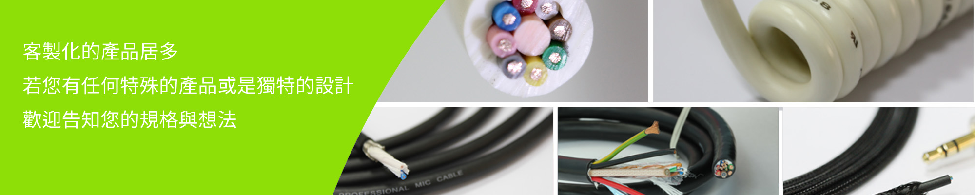 PU線、麥克風線、耳機線、多芯線、音響線、USB3.0線、設備控制線、複合電纜及各種符合UL、CSA產品認證線材。